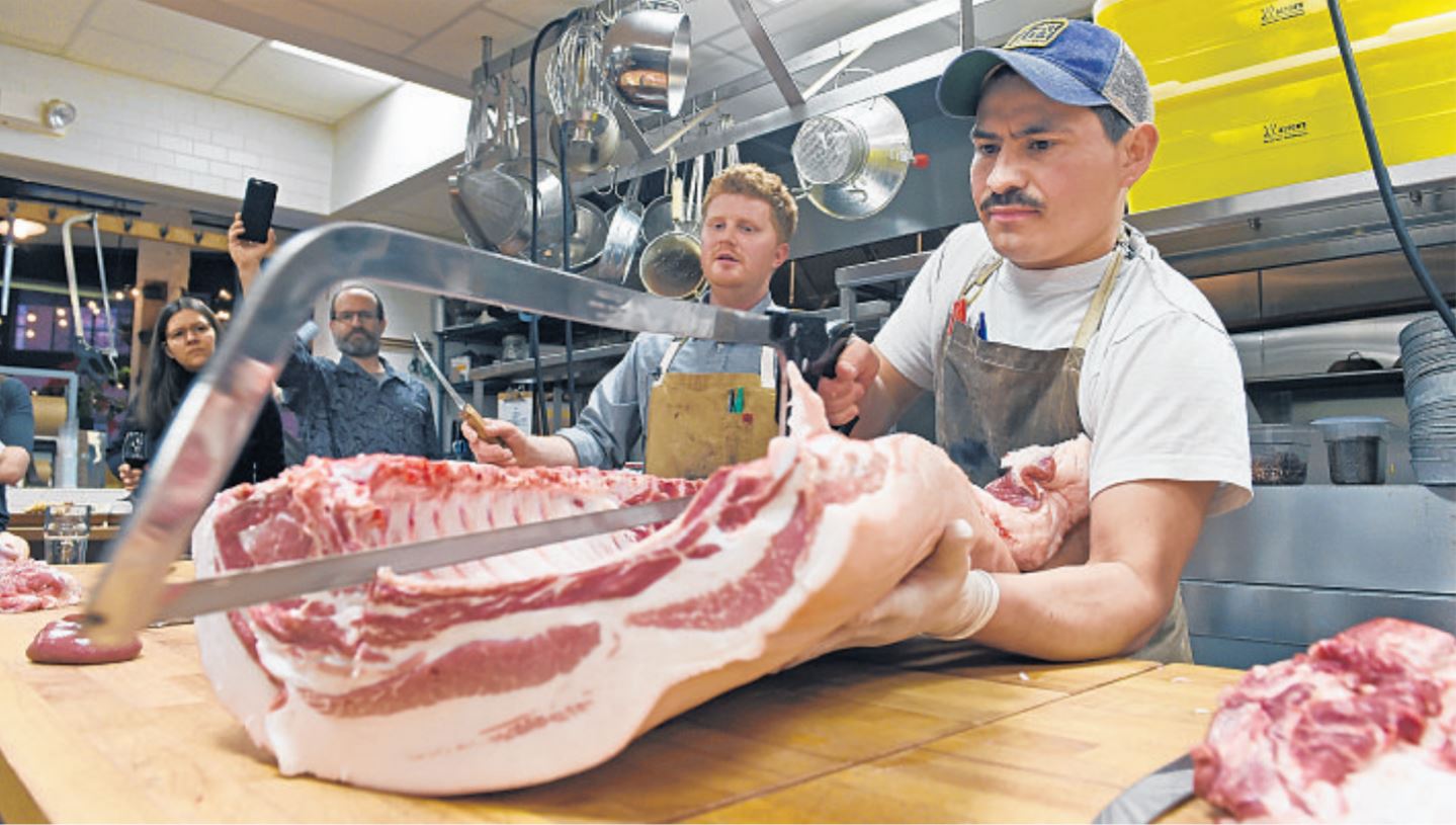 Master butcher George Marsh breaks down a pig piece-by-piece in a butchery demonstration at Parts & Labor. The classes are becoming more common as whole-animal butcher shops grow in Maryland.